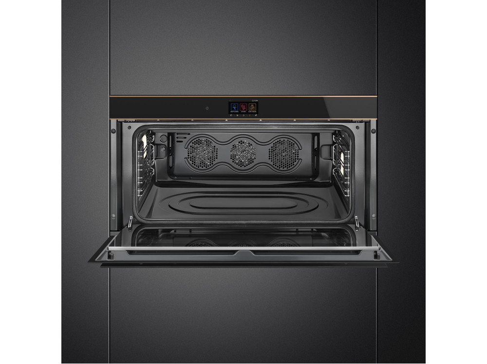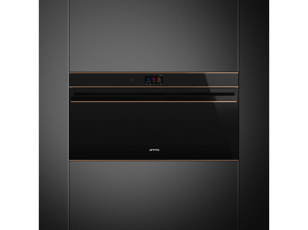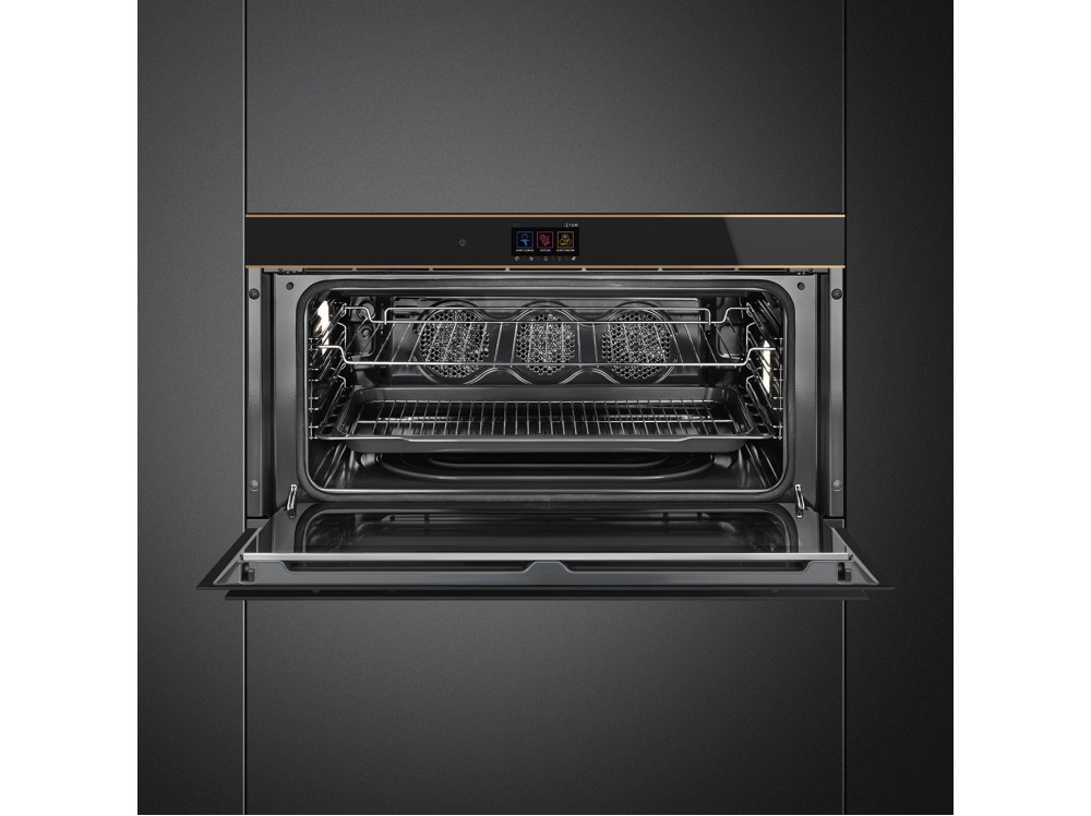 Духовой шкаф Smeg SFPR9604TNR из коллекции Dolce Stil Novo выполнен в черном цвете. Дизайн прибора дополняют медные профили. Модель шириной 90 см обладает объемом в 85 литров, что позволяет комфортно готовить несколько блюд сразу или, например, запекать индюшку целиком. Удобное управление при помощи сенсорного дисплея обеспечивает быструю настройку параметров работы устройства: выбор режима приготовления, температуры, времени, а также таких функций, как отложенный старт или размораживание.