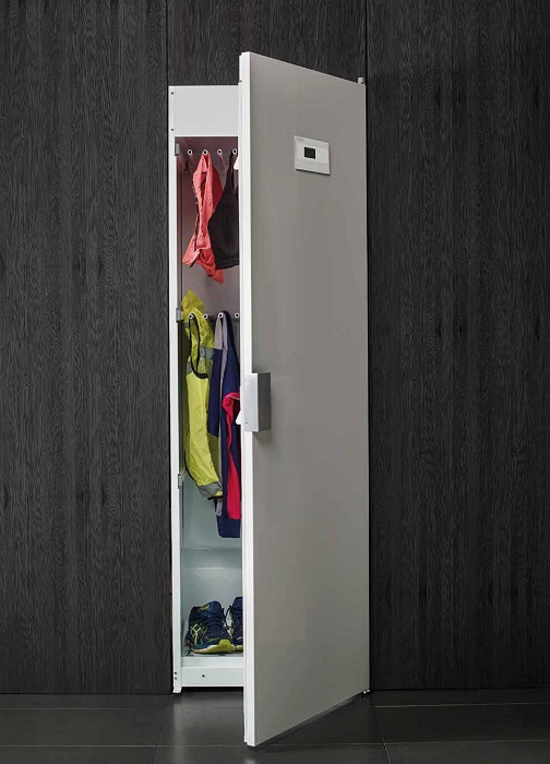 Прибор является отдельно стоящим и подключается к вентиляции для эффективной работы вытяжной системы. Перенавешиваемая дверь обеспечивает удобство эксплуатации вне зависимости от расположения. Нагревательный элемент и вентилятор находятся в верхней части, что обеспечивает максимально эффективное движение теплого воздуха. Наличие термовыключателя помогает регулировать температуру внутри, а плотно закрывающаяся при помощи уплотнительной ленты дверь снижает уровень шума.